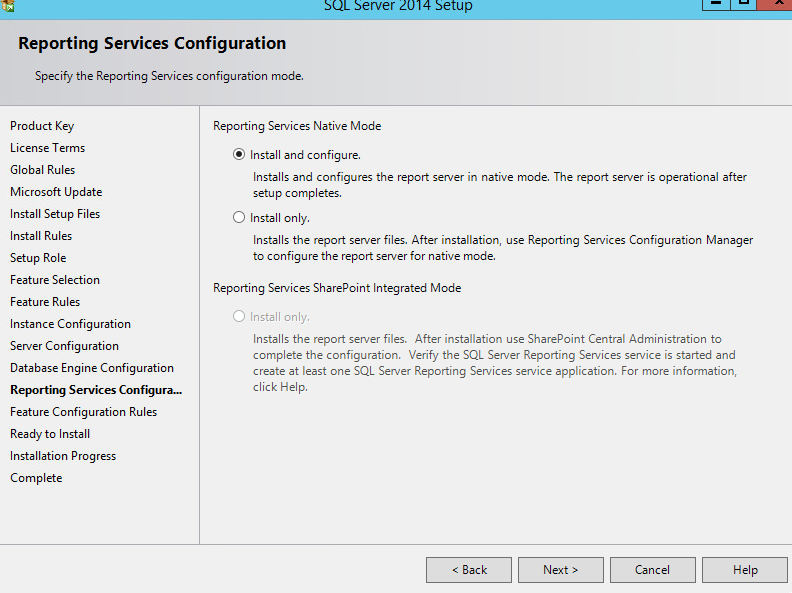 Note: The following screen will be displayed only if you have selected the Reporting Services – Native feature. - In this screen, define if you want to configure the reporting services feature now or if you want to configure it later. Select Install only to install the feature and configure it later. ClickNext to continue.